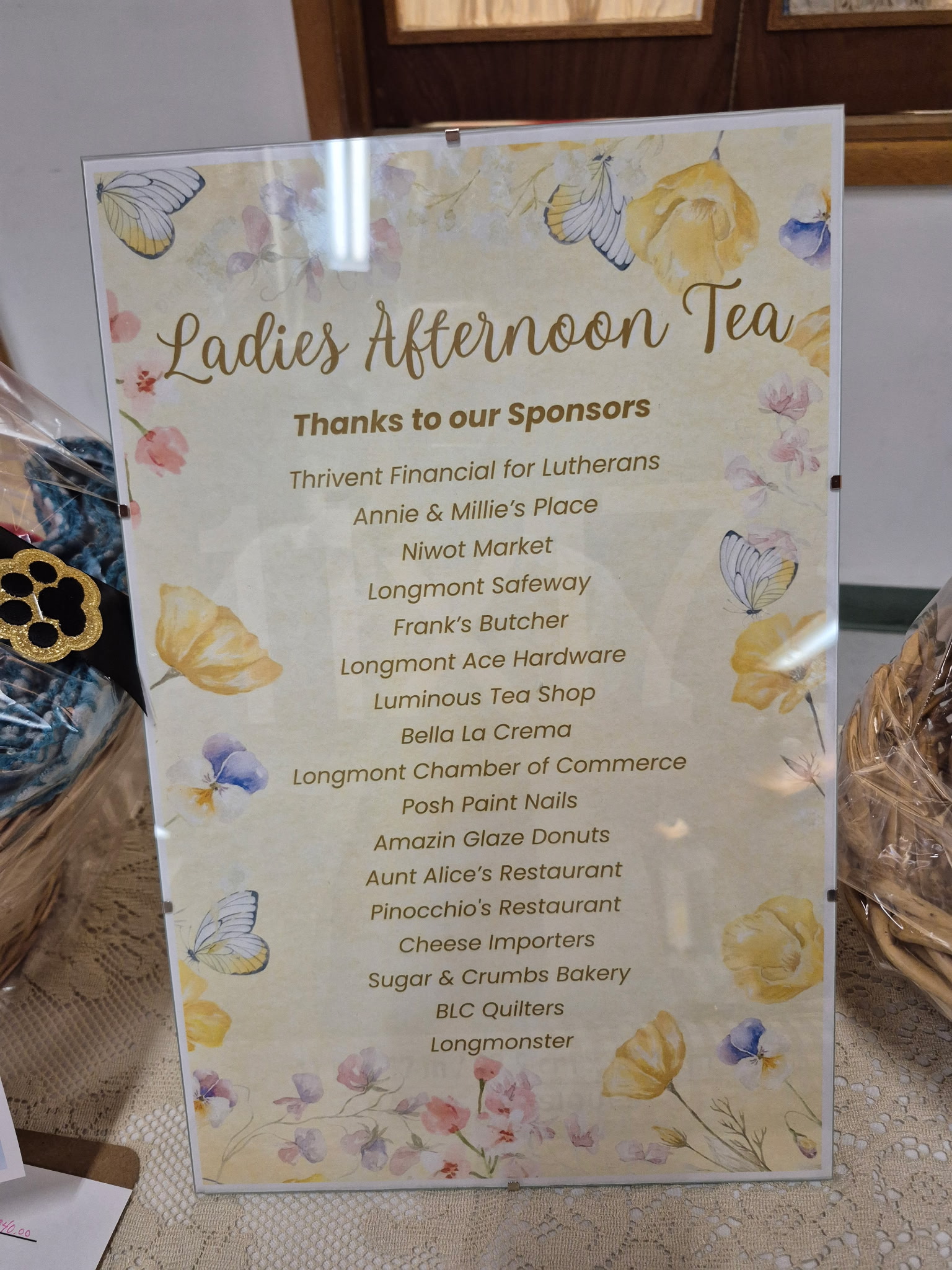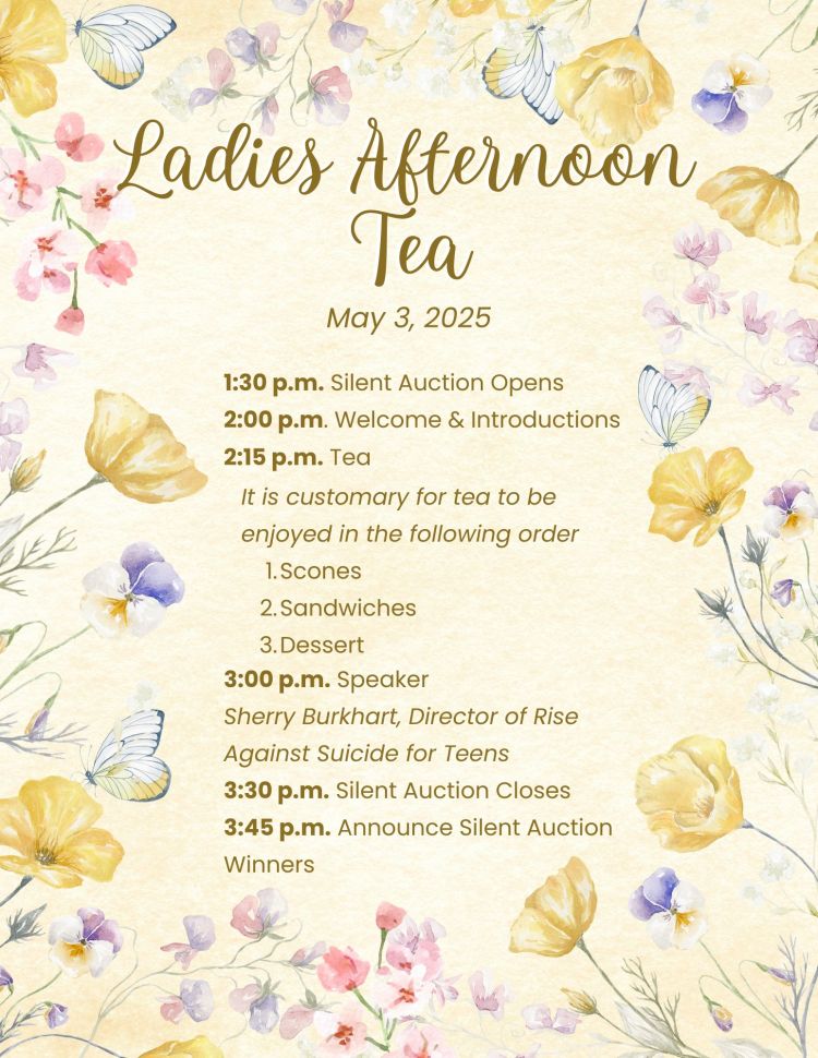 The Ladies Tea was awesome. It was beautiful, approximately 80 people attended from our Longmont communities. Sherry Burkhard, Executive Director of Rise Against Suicide for Teens was our speaker. A tremendous speaker for a taboo subject. She told her story and journey of her life. Basically the “elephant in the room”.