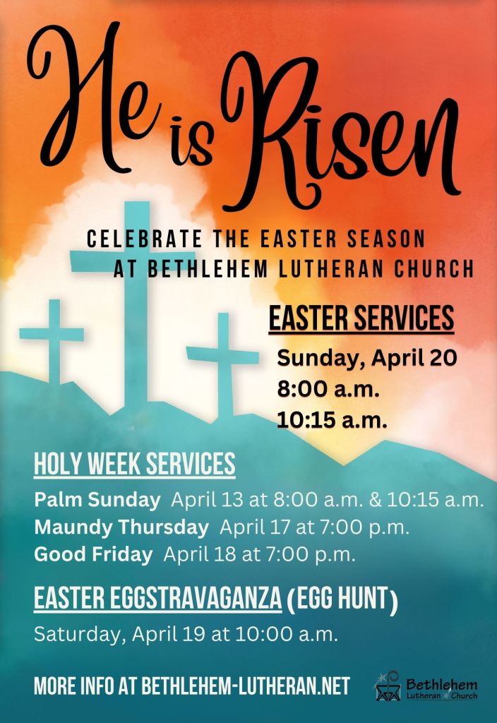 Our Lenten tradition at Bethlehem is to enjoy soup and bread fellowship on Wednesdays before midweek Lent services. The neighborhood groups take turns providing the soups, relishes, and desserts. The Evangelism Committee provides the bread. The assignments are the following (sorry, Purple, you serve twice, but you will serve less at the summer coffees). We do keep a record and try our best to share the burden.